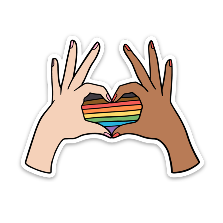 Brittany Paige Pride Heart Sticker featuring rainbow-colored hands forming a heart, available at Be Charmed.