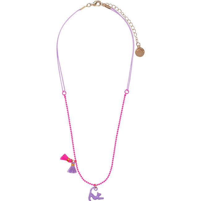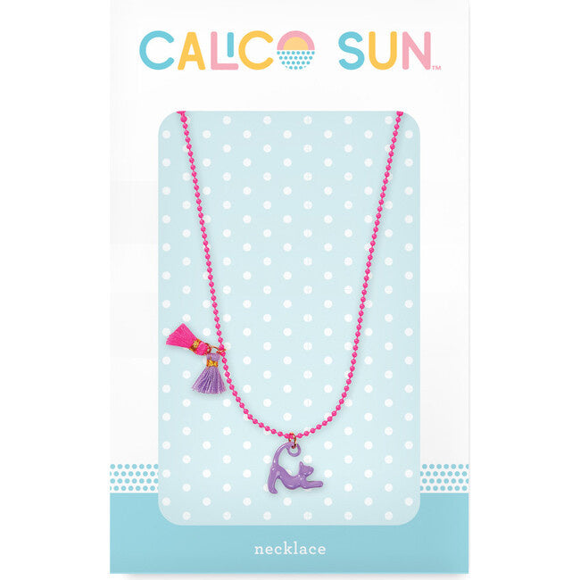 Zoey Cat Necklace by Calico Sun—a playful enamel purple cat charm with pink/purple tassels on adjustable pink ball chain, available at Be Charmed.