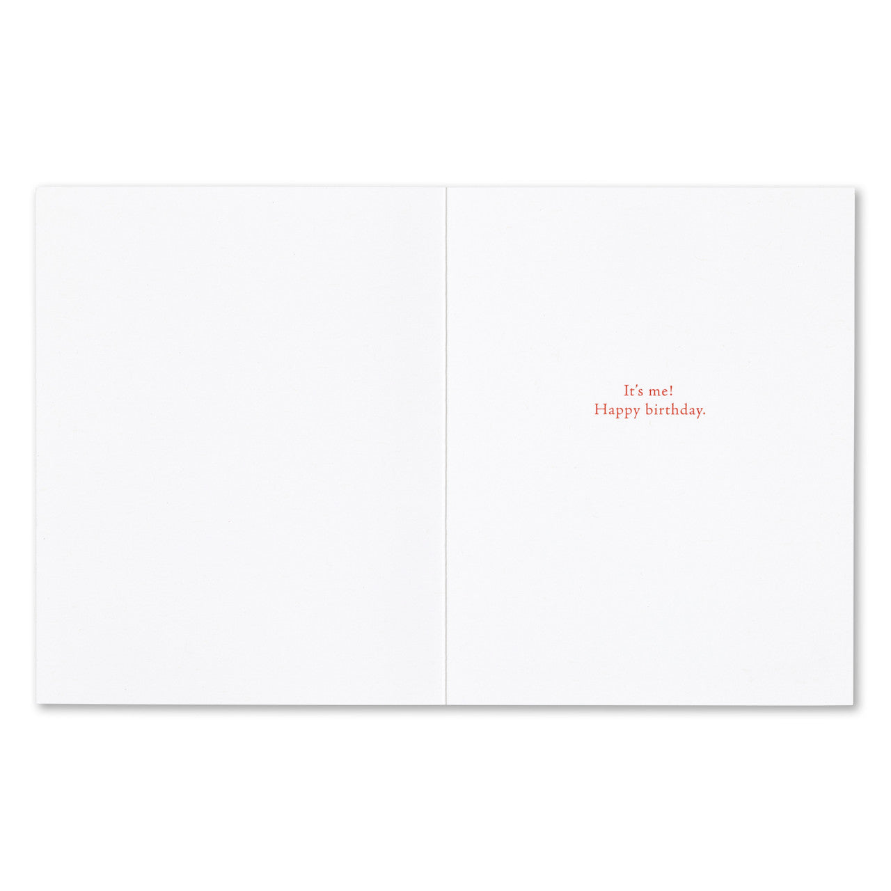 White greeting card with red text 'Happy birthday.' Available at Be Charmed
