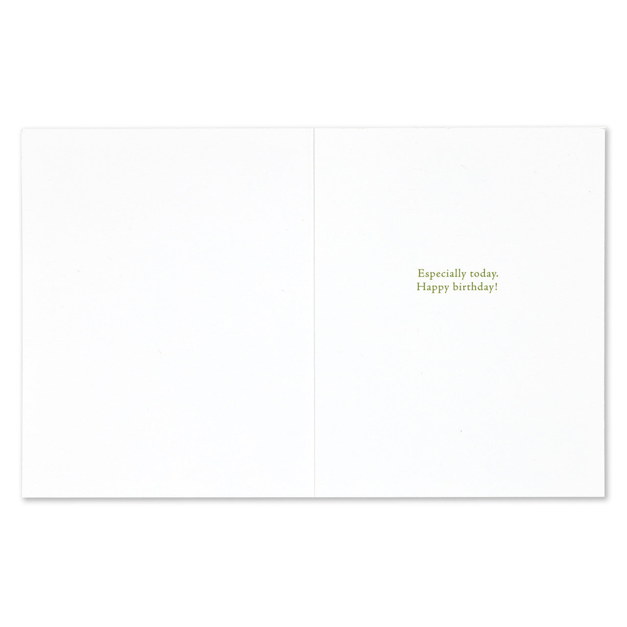 White card with 'Especially today. Happy birthday!' text in green on a white background. Available at Be Charmed