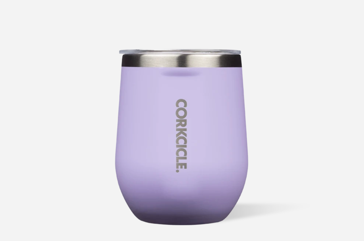 Corkcicle 12oz Stemless wine tumbler in soft Lilac color with triple-wall vacuum insulation for temperature retention, spill-resistant sliding lid, ergonomic shape, soft-touch powder coating finish, and durable stainless steel construction. Available at Be Charmed.