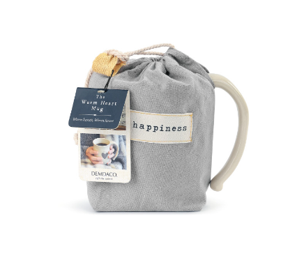 Demdaco “Happy” Heart Mug in pouch, 16 oz stoneware with heart cutout and “Happy” sentiment, cream finish—microwave & dishwasher safe—available at Be Charmed.