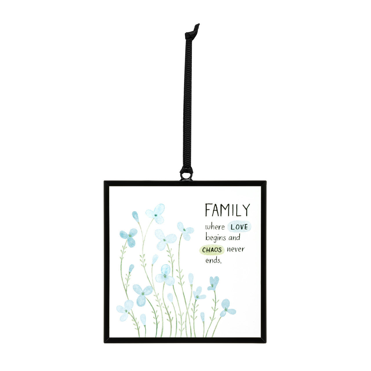 Demdaco Family Love & Chaos glass suncatcher, 3″ square with iron frame and printed sentiment “Family where love begins and chaos never ends”–Available at Be Charmed.