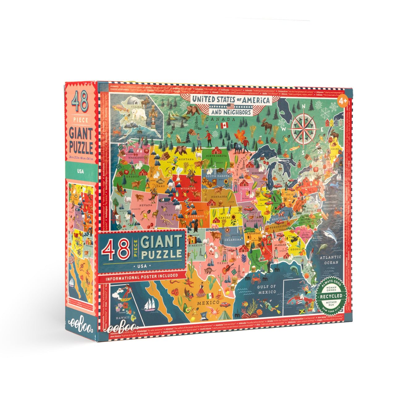 A carefully researched and beautifully designed pictorial map of the U.S.A and its neighbors, brimming with icons by Uta Krugmann offering information about natural and cultural landmarks, industry, agriculture, and wildlife. Includes a color poster identifying these icons. An accessible, educational puzzle offering lessons in geography and beyond.