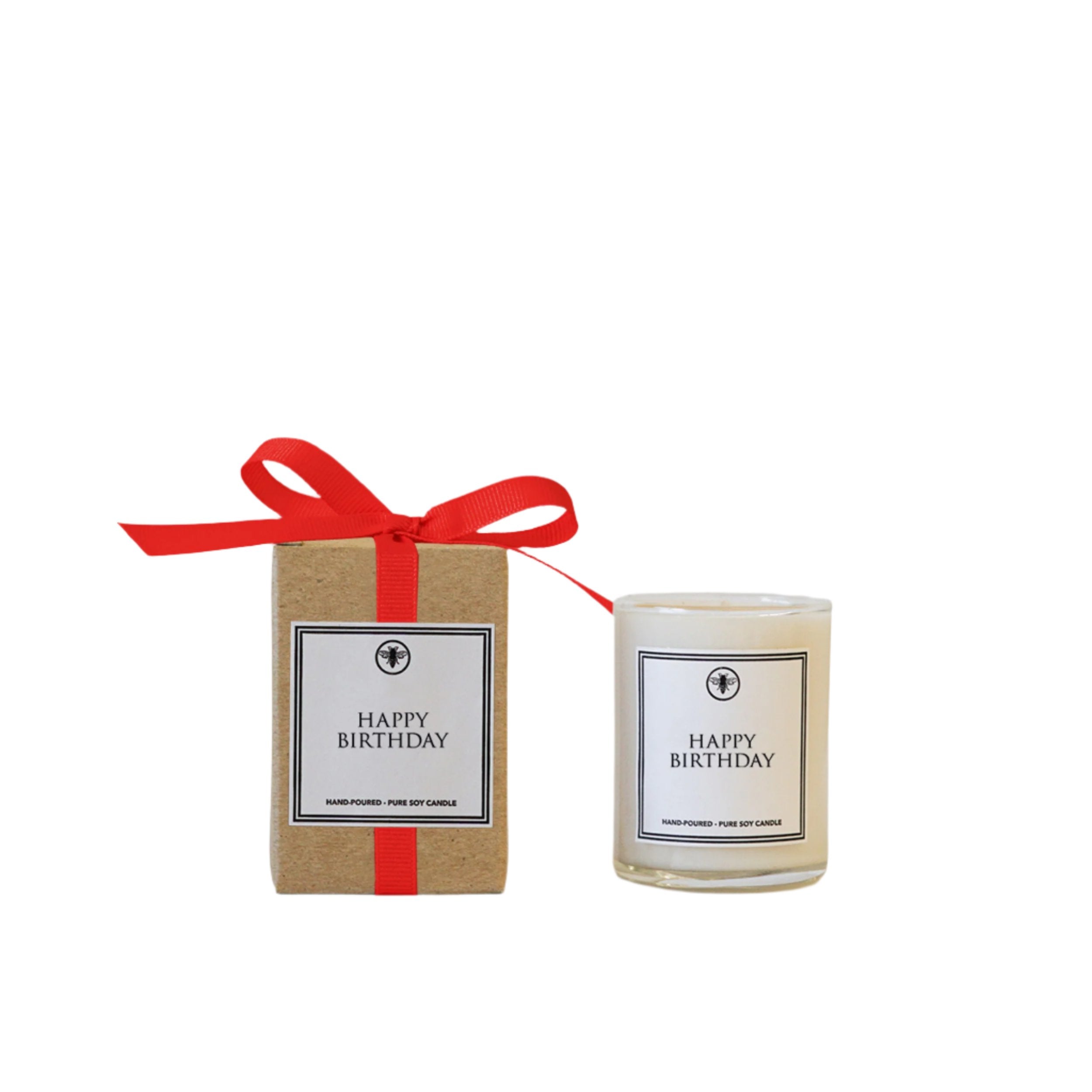 A 3oz candle with a white label that reads 'Happy Birthday', presented in a kraft paper box with a red ribbon. Available at Be Charmed