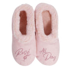 It's definitely 5 o'clock somewhere, so why not rosé all day? Let's propose a toast to these adorable blush pink footsies with their playful message and elegant soft fur lining. Keep your toes cozé while you sip your rosé. Smooth finish outside with an elegant soft fur lining. Bury your toes in these playful, joy inspiring slippers with a hint of elegance and full foot of cozy!