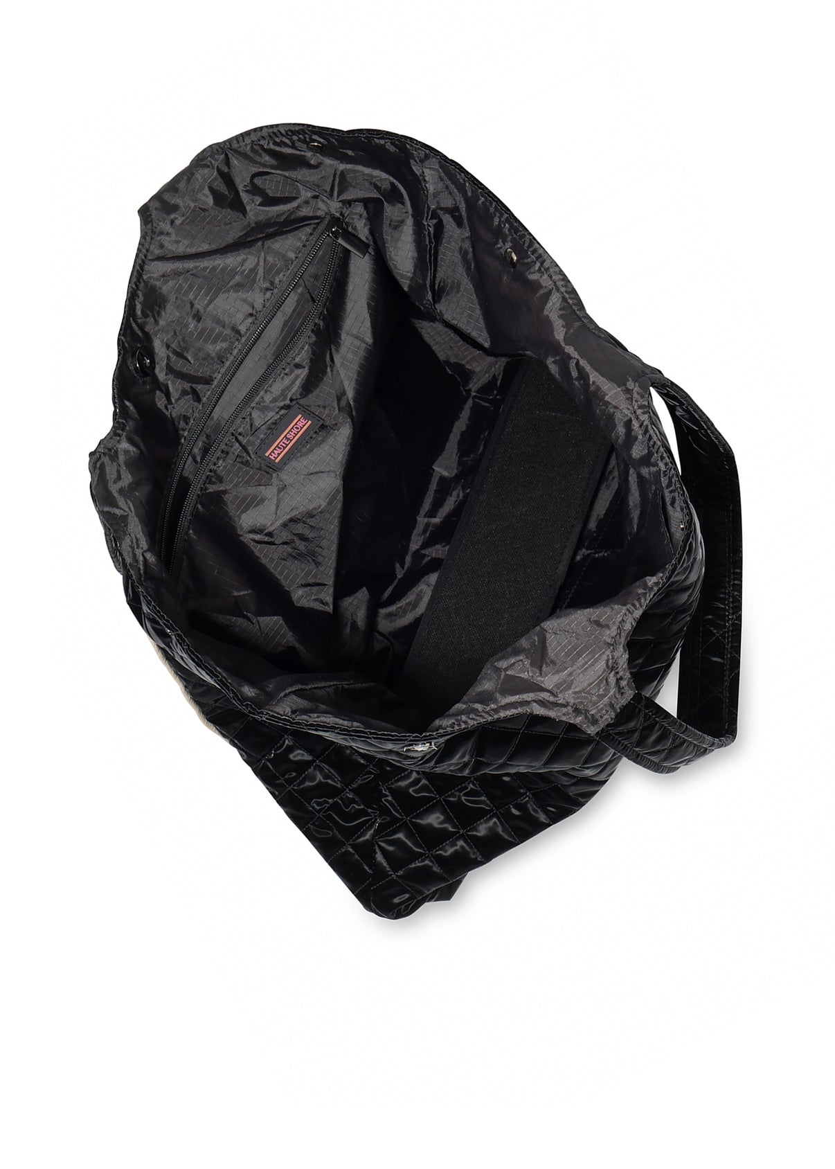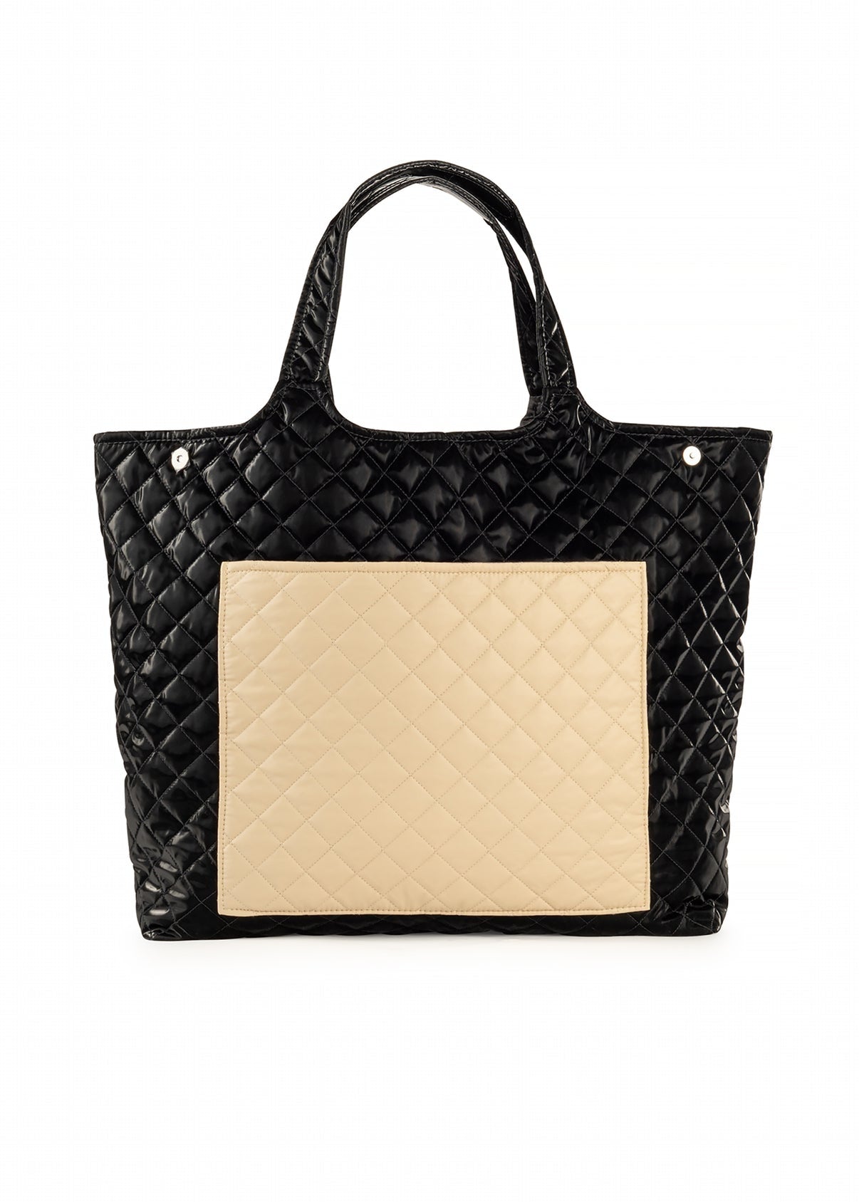 Quilted puffer tote with large exterior slip pocket and interior zip and slip pockets.