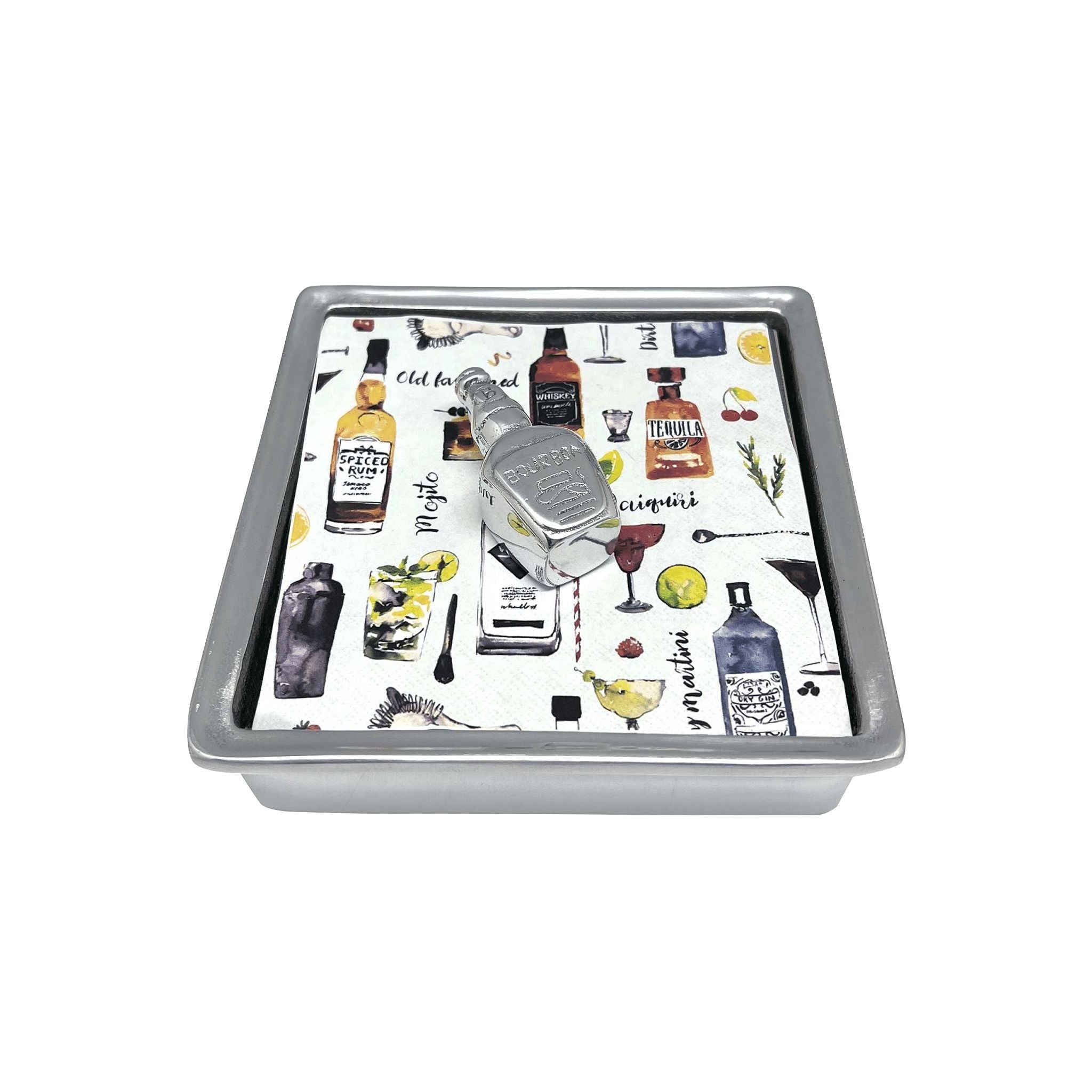 The Mariposa Signature Napkin Box with Bourbon topper adds charm and sophistication to any table. Crafted from recycled aluminum, it’s ideal for cocktail napkins and makes a perfect gift.