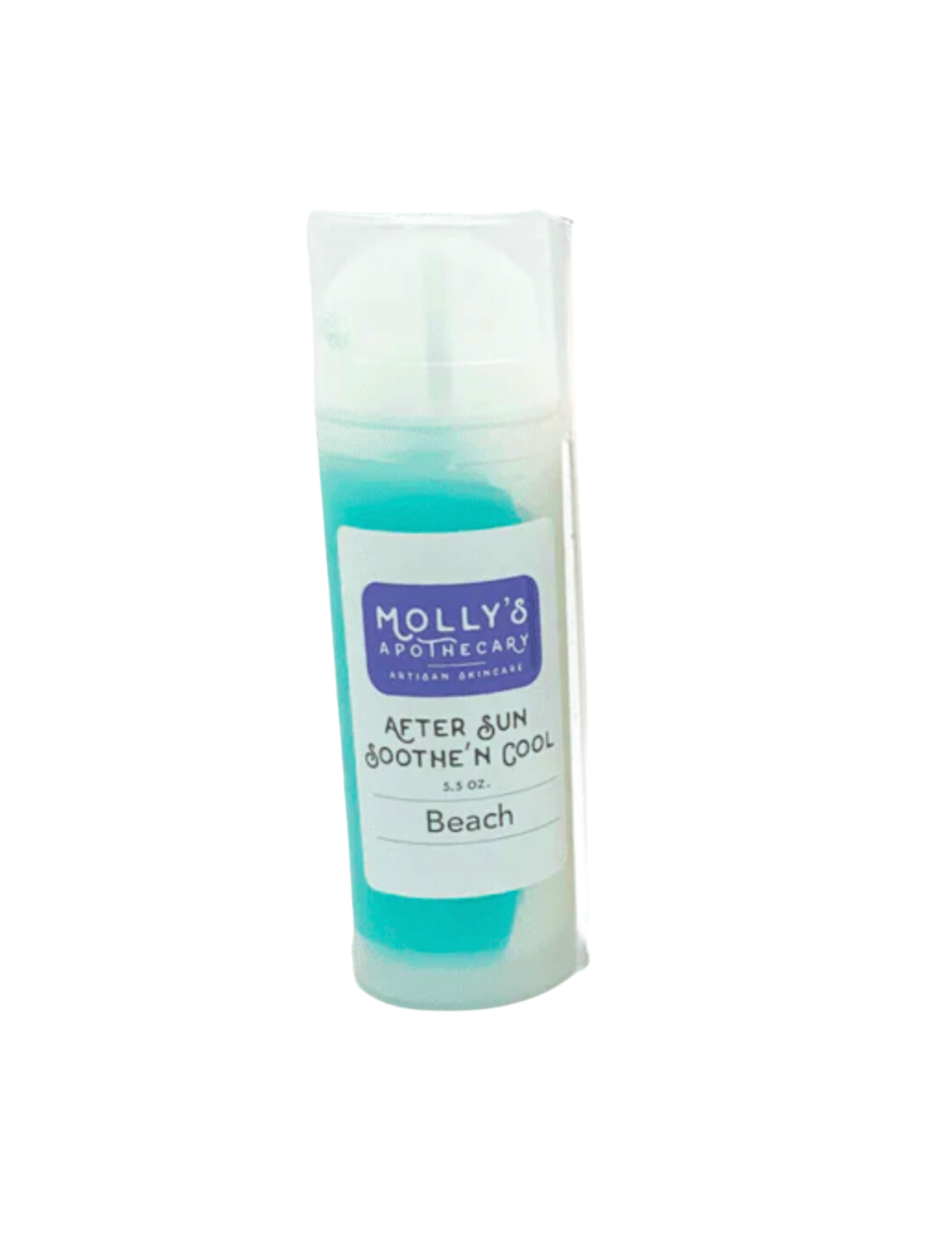A bottle of Molly's Apothecary After Sun Sooth and Cool Beach, which appears to be a gel product with a blue tinted container and a white cap. Available at Be Charmed