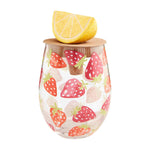 You'll be living the sweet life with this Strawberry Wine Glass Set. The two piece set comes with a stemless wine glass. The wine glass features a detailed strawberry print on the exterior. The wine glass also comes with a hand-painted ceramic fruit wine bottle topper with cork stopper.