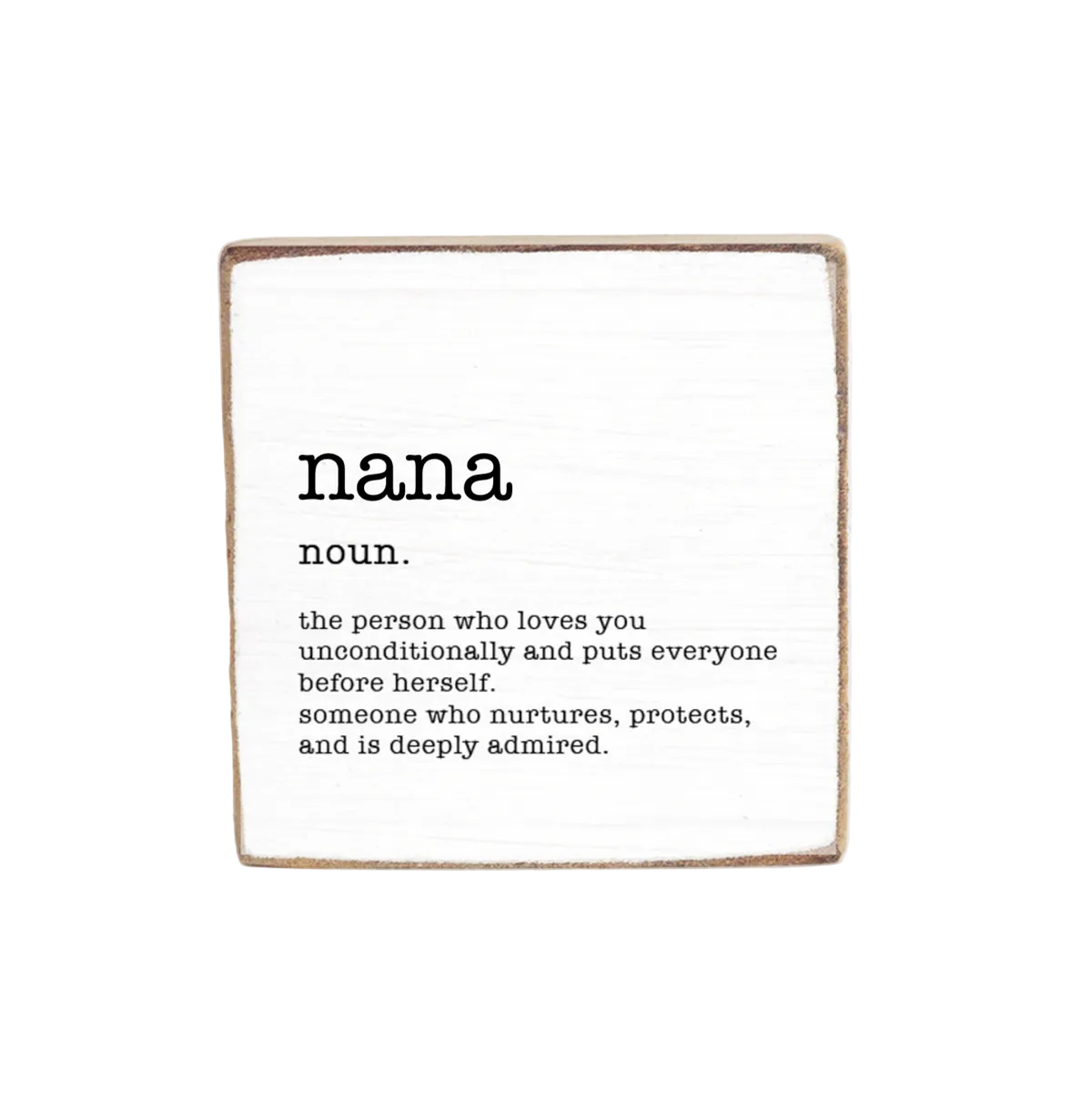 A handcrafted wooden block with the definition of 'nana' printed on it, placed on a white surface with a plant to the side.
